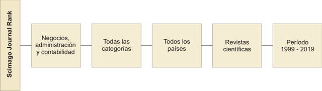 En la primera etapa, el universo censal estuvo conformado por 1 448 revistas científicas procedentes de todos los países del mundo indizadas en Scopus, registradas en la categoría “negocios, administración y contabilidad” al 2019. Si bien no fue necesario aplicar criterios de exclusión, es importante resaltar que sólo se consideraron revistas científicas; quedando fuera del universo de interés: revistas de negocio, serie de libros, conferencias y congresos. El periodo de tiempo abarcó todos los años disponibles en esta base de datos a enero 2021, es decir de 1999 a 2019. Los criterios de selección mencionados se muestran de manera gráfica en la Figura 1.