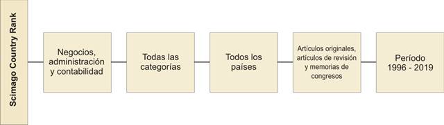 e presentó un estudio de corte longitudinal realizado bajo un enfoque cuantitativo que aplicó censos a las siguientes poblaciones: 1) revistas científicas de la categoría “negocios, administración y contabilidad” indizadas en la base de datos bibliográfica de Scopus hasta el año 2019; 2) países con al menos un investigador que haya publicado en una revista indizada en Scopus al año 2019. En este sentido, la investigación se desarrolló en dos etapas: primero, se ejecutó un análisis de la participación e impacto de revistas científicas según país de procedencia en un período que abarcó de 1999 a 2019; segundo, se estudió la clasificación de países según la participación e imparto generado por sus investigadores en un periodo de tiempo comprendido entre 1996 y 2019. En ambos casos la descarga de información se realizó en enero 2021 del sitio oficial de SCImago Journal & Country Rank.