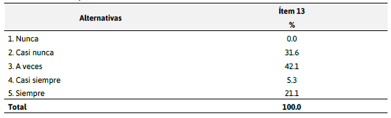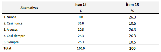 De la Tabla 5, para el ítem 14. Se tiene la opción “casi nunca” es la que representa la mayoría con un 36.8% seguido de las opciones “casi siempre” y “siempre” con un 26.3%, la opción “nunca” no tuvo respuesta alguna. Para el ítem 15 se puede observar que hay 3 respuestas que predominan, que son “nunca”, “a veces” y “casi siempre” con 26. 3% y las opciones “casi nunca” y “siempre” con un 10.5%.