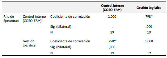 Luego de haber efectuado el análisis descriptivo, se procedió al análisis de la correlación de variables expuesta en la Tabla 9. En la correlación de las variables se observa que la correlación por Rho de Spearman es de Rho=0,798; Sig.=0,00<0,05) positivo. Ello, añadido a los resultados del Alfa de Cronbach: 0,838 (v. control interno (COSO-ERM)) y 0,845 (v. gestión logística), evidencian un vínculo elevado entre las variables propuestas; por tal razón, se puede afirmar que, en efecto, la variable control interno (COSO-ERM) incide sobre la variable gestión logística.