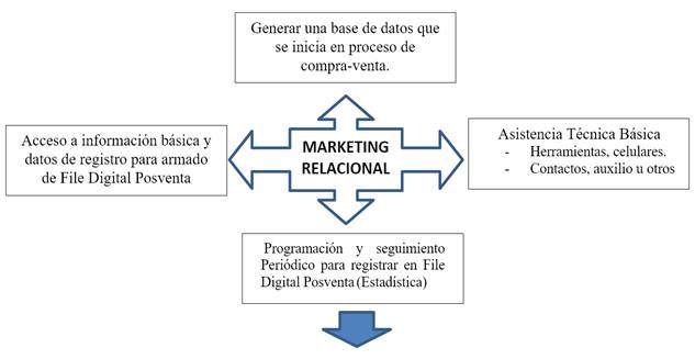 Se plantean etapas que involucran al área de ventas como punto de contacto inicial con el cliente y como fuente de información para las demás áreas, en este caso para el área de posventa, seguimiento cronológico, servicios extraordinarios, y capacitaciones a consideración en la empresa entre otros.