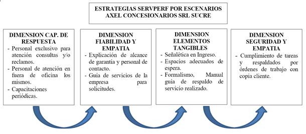 En función al estudio realizado y según la teoría aplicada acorde al Modelo Servperf, la empresa va a encontrar escenarios, a ser planteados por los mismos clientes y que se los fue descubriendo a lo largo de la investigación, para los que se plantea una directriz de las acciones a realizar de acuerdo con la importancia de las dimensiones e ítems para los clientes y las posibilidades de la empresa.
