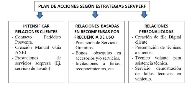 e concluye que la venta de vehículos nuevos puede potenciarse elevando el componente de servicios, diferenciándose así de la competencia y fidelizando a los clientes. En el contexto particular de la empresa Axel Concesionarios de Imcruz SRL Sucursal Sucre, se logró demostrar la relación directa entre satisfacción de servicios (en sus 5 dimensiones) y fidelización, a través de la aplicación del Modelo Servperf. Se estimó que es factible alcanzar un punto máximo de satisfacción de los clientes (en este caso el tiempo estimado es 12 meses), aplicando una estrategia de fidelización enmarcada en técnicas propias del marketing relacional de base de datos que, en este caso, sugieren seguir sistemáticamente 4 etapas: a) proceso de compra-venta (cobertura de garantía), b) interacción área de venta y área posventa, c) seguimiento posventa d) personal de asistencia técnica posventa.