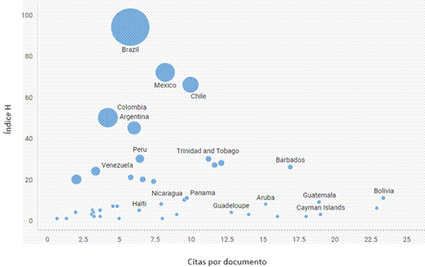 Categorizando según índice h (véase clasificación en Tabla 7), las primeras 5 participaciones – Brasil, México, Chile, Colombia y Argentina – coinciden con los países con mayor cantidad de revistas científicas de Latinoamérica (Tabla 3). Sin embargo, Perú sin tener revistas científicas nacionales, on h30 (país que cuenta con 30 artículos con al menos 30 citaciones) ocupa el sexto lugar de la región. Algo similar ocurre con Trinidad y Tobago, Costa Rica, Jamaica y Barbados.