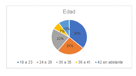 En cuanto a lo que son las edades la mayoría de los encuestados, se muestra en el Gráfico 2 que, están entre los 18 hasta los 23 años con un 36% equivalente a 137 encuestados, entre los 24 hasta los 29 años en un 25% que equivale a 96 encuestados, entre los 30 hasta los 35 años un 22% equivalente a 84 encuestados. Los resultados evidenciaron que todas las personas encuestadas están dentro el parámetro de población establecida por la muestra aleatoria simple.