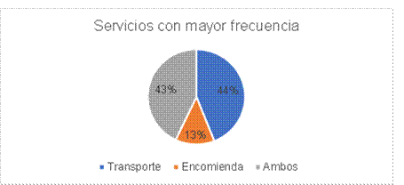 En el Gráfico 5, se muestra que, el 44% de los encuestados utiliza el servicio de transporte de pasajeros, y el 43% utilizan ambos servicios tanto el de transporte como el de encomiendas de todas las rutas que brinda la línea Sindical Trans. Emperador, y el 13 %, hace uso exclusivamente del servicio de envío de encomiendas.