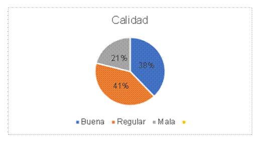 En el Gráfico 6, se muestra que, el 41% de las personas encuestadas indicaron que la calidad del servicio es regular, el 38% están conformes respecto a la calidad del servicio prestado y solo un 21% no se encuentra satisfecho con la calidad del servicio prestado que equivale a 33 clientes de las 162 personas que fueron encuestadas.