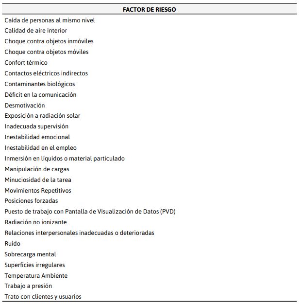 Existen varias orientaciones para evaluar los factores de riesgo psicosocial que sigue seis fases: 1) Identificación de los factores de riesgo; 2) Elección de la metodología, técnicas e instrumentos que se han de aplicar; 3) planificación y realización de trabajo de campo; 4) Análisis de los resultados y elaboración de informe; 5) Elaboración y puesta en marcha de un programa de intervención; 6) seguimiento y control de las medidas adoptadas. Como parte de la metodología se tomaron las cuatro primeras fases para evaluar los factores de riesgo psicosocial. Se realizó una matriz de cumplimiento legal, basada en la norma técnica 330 del sistema simplificado de accidentes de trabajo. Se describieron los factores de riesgo laboral identificados a través del análisis de la matriz de riesgos a través del análisis de 60 puestos de trabajo que se clasificaron en puestos clave, estratégicos y de soporte. La población fue de 172 personas que incluyó a: 94 mujeres, 78 hombres y 5 personas con capacidades especiales. Los factores de riesgos identificados fueron (Tabla 1).