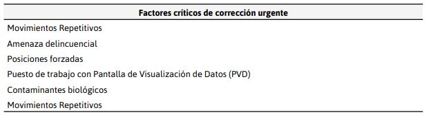 Tabla 3. Lista de factores críticos reportados que requieren una corrección urgente en varios puestos de trabajo.