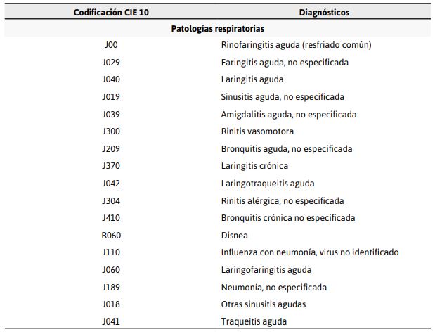 Dentro de las 10 primeras causas se aprecian que el 18,5% las representan los procesos músculo-esqueléticos (entre los que más se evidencian son inflamación de los codos o epicondilitis y las cervicalgia), seguidos por el 17,7% de los casos por problemas respiratorios (en mayor medida los asociados a las vías respiratorias altas); se presenta un 11,4% por patologías de orden metabólico (principalmente las hiperlipidemias) y porcentajes menores las Gastroenterológicas, diagnósticos neurológicos, infecciones, otorrinolaringológicas, traumáticas, ginecológicas y psicológicas. La tabla 4 detalla los diagnósticos más comunes en las dos primeras categorías de patologías.