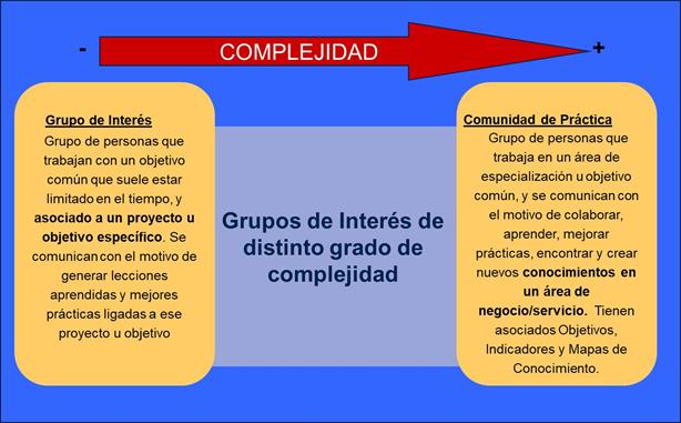 Dentro de la complejidad están inmersos de los grupos de interés y las comunidades de práctica y siendo la gestión de estos menos complejo que las comunidades de práctica, (Sanz, 2005). como se muestra en la Figura 1.