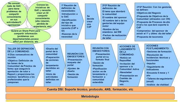 El esquema metodológico según Mendoza et al., (2006) de la gestión del conocimiento a partir de las comunidades de práctica se puede indicar en la siguiente Figura 3.